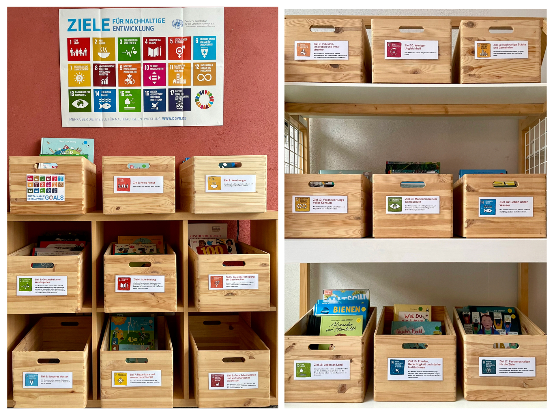 In unserer 17-Ziele-Bibliothek finden sich Bücher zu allen 17 Zielen für nachhaltige Entwicklung (SDGs). Jedes Ziel hat in einer Lesekiste seinen festen Platz – gut sichtbar gekennzeichnet und für die Kinder leicht auffindbar. Ob spannende Geschichten, kindgerechte Sachbücher oder inspirierende Erzählungen über mutige Menschen: Zu jedem Nachhaltigkeitsziel gibt es passende Literatur, die zum Nachdenken anregt und zum Handeln ermutigt. Die Schülerinnen und Schüler wählen ihr eigenes Thema aus und entdecken selbstständig, wie wichtig Gesundheit, Bildung und Gleichberechtigung sind, warum Klima- und Umweltschutz uns alle betrifft und wie Zusammenarbeit und Frieden unsere Welt stärken.