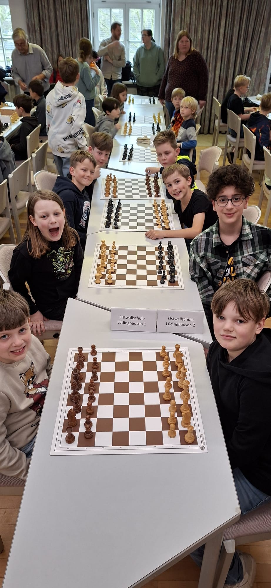 Am Freitag, 13. März 2026 hat unsere Schach-AG des 4. Jahrgangs an der kreisweiten Schulschachmeisterschaft in Billerbeck teilgenommen. Insgesamt 13 Jungen traten in drei Teams gegen andere Grundschulteams im Kreis Coesfeld an. Die Kinder zeigten über 5 Partien viel Konzentration, Ehrgeiz und strategisches Denken. Unsere Spieler konnten einen großartigen Erfolg erzielen und erreichten den 1., 8. und 9. Platz. Begleitet wurden die Schüler von unserer Schulsozialarbeiterin Frau Heckes und zwei engagierten Vätern. Für alle Beteiligten war es ein spannender und erfolgreicher Tag. Die Schulschachmeisterschaft wurde seit Jahren erstmals wieder vom Schulamt im Kreis Coesfeld organisiert.